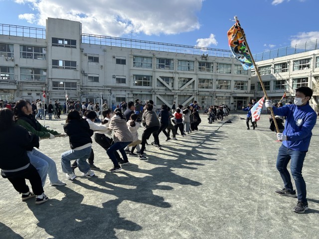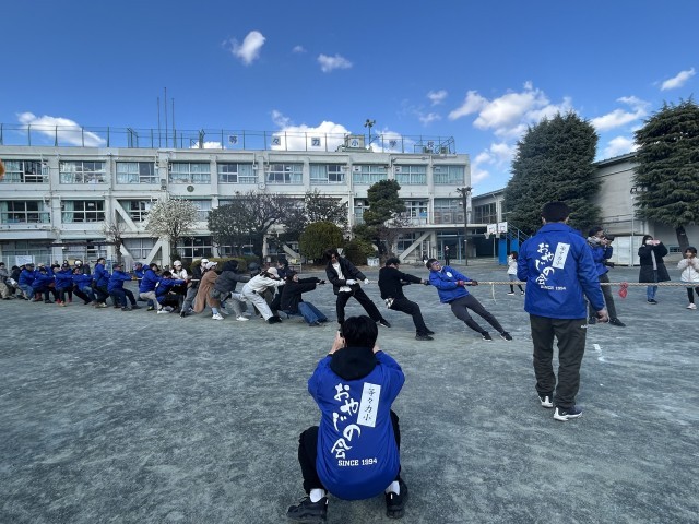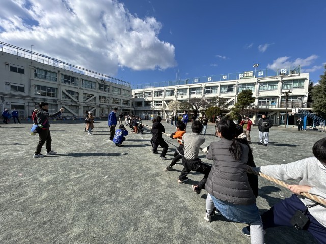 防災体験のあとは、ミニ運動会。まずはクラス対抗綱引き。優勝は2組でした!続いて大人とも対戦。子どもの方が人数が多いハンデ戦でしたが、大人気なく大人の圧勝でした。