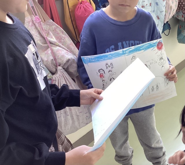 2年生は国語の学習で1年間学んだことの中で楽しかったことを紹介する準備をしています。画用紙の裏に発表する文章を書き、表には絵を描いています。出来上がった子から練習をしていました。練習後、アドバイスを求める姿から意欲が高まっていると感じました。