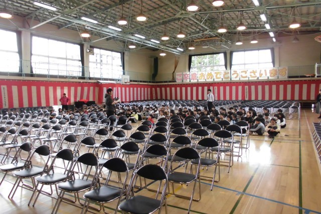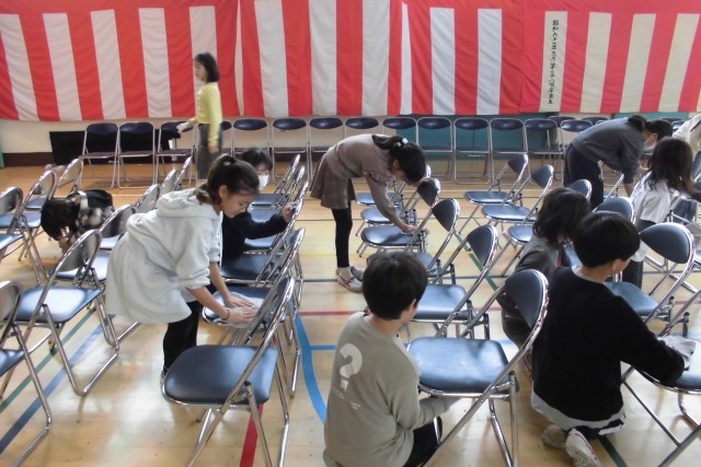 明日の卒業式のために、以前に会場設営をしてくれた5年生。それからしばらく時間が経ち、ほこりが目立つようになってしまいました。今日は、5年生全員で椅子を全部どかし、モップ掛けや雑巾がけをしてくれました。5年生のおかげで明日の卒業式美しい式場で挙行できます。5年生のみなさんありがとうございました。