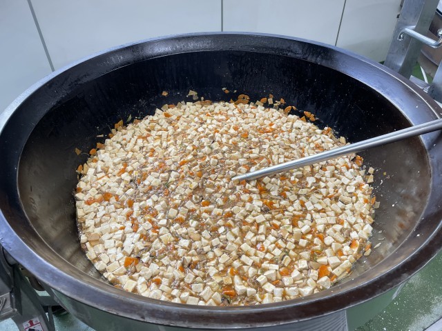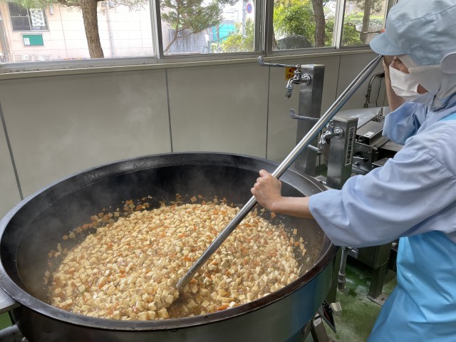 豆腐の中華炒めは、豆腐を全部で82kg使って作りました。給食で届けてもらっている豆腐は特大サイズなので、130丁くらいでしたが、普通の豆腐1丁の大きさだと270丁分のお豆腐を使いました。野菜とお肉のうまみも合わさって美味しく出来上がりました。ごはんと一緒に食べるととっても美味しいので、ごはんも空っぽになるクラスがたくさんありました。もやしのコチュジャンかけは、コチュジャンとごま油、塩、こしょう、醤油を合わせてタレを作り、もやしときゅうりとにんじんと和えました。こちらもたくさん食べていました。