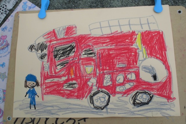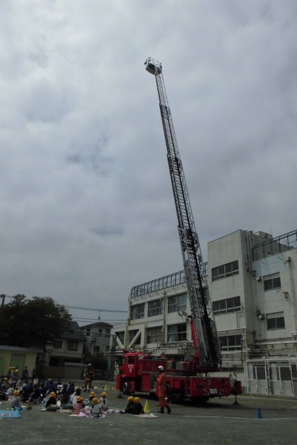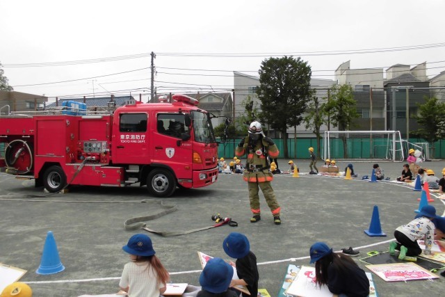 今日、1・2年生は、消防写生会を行いました。玉川消防署のみなさんに、消防車2台でご来校いただき、迫力ある消防車の目の前でみんな伸び伸びと絵を描くことができました。はしご車のはしごを伸ばしてもいただき、子どもたちみんな大喜びでした。教室で仕上げをして、後日展示をいたします。楽しみにしていてください。玉川消防署の皆様本当にありがとうございました。