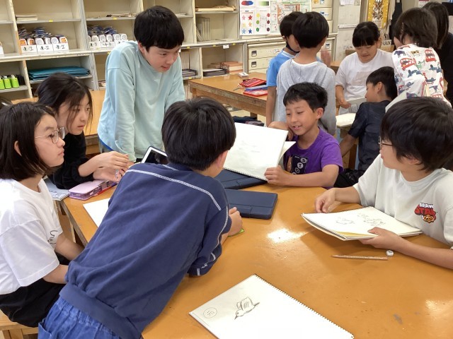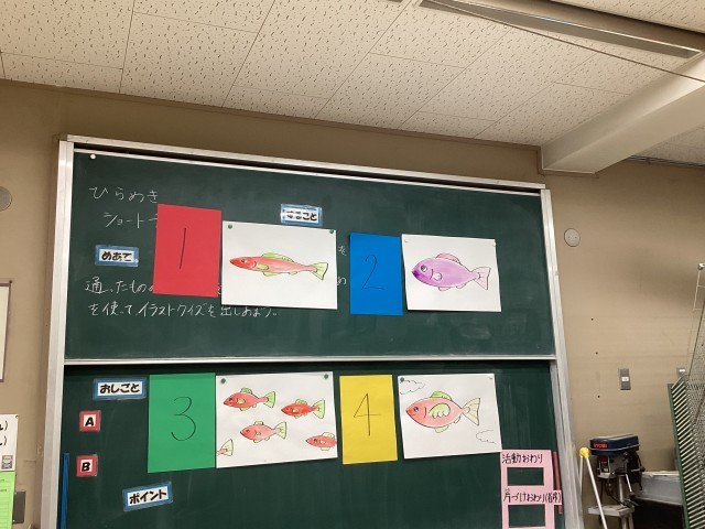 本日は5時間授業のため、5年生は1時間だけの図工。いつもの作品づくりではなく、イラストゲームをクラスで行いました。元の絵が1〜4のドアを通るとそれぞれ「大きさ」「色」「数」「性質」が変わるというルールの元でクイズづくりをして、友達同士で問題の出し合いをしました。大盛り上がりであっという間の45分でした。