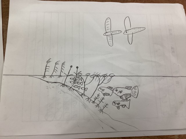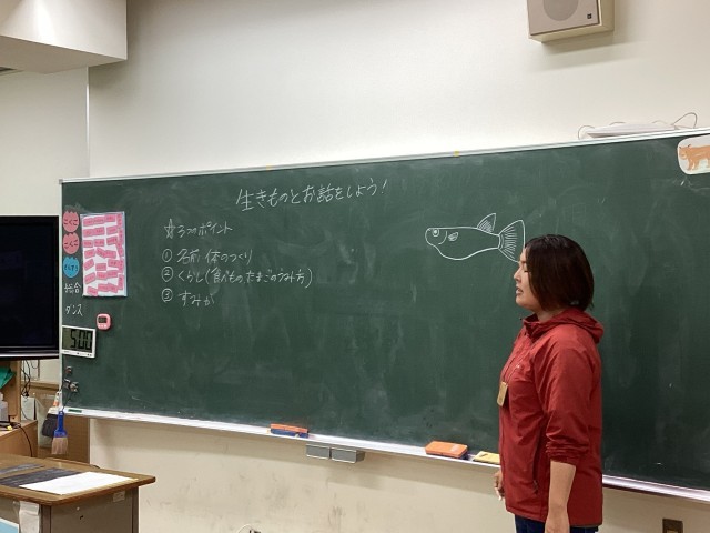 毎年3年生がお世話になっているビオトープギルドの先生が来校し、ビオトープにいる生き物について教えてくれました。今日のめあては「生き物ともっとお話をしよう」です。メダカの生態について、なぜ背中が平らなのか、目が上の方についている理由など生きていくために必要なことであることを知りました。メダカが増えるために私たちは何をすればいいのかについて考え、自然と一緒に生活していくための大切さを学ぶことができました。