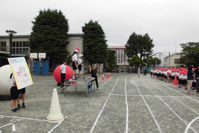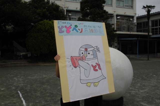 今日は第1回の運動会全体練習がありました。準備運動、大玉送りの練習です。今日は白組が勝ちましたが、本番どちらが勝つでしょうか。楽しみですね。今年の運動会のマスコットキャラクターも投票により決まりました。「とどペン応援団長」です。6年生の児童が考えてくれました。とどペン応援団長にも応援してもらいないがら、精一杯力を発揮することを願っています。