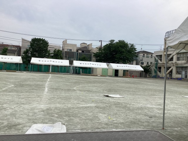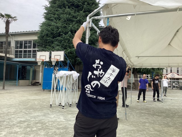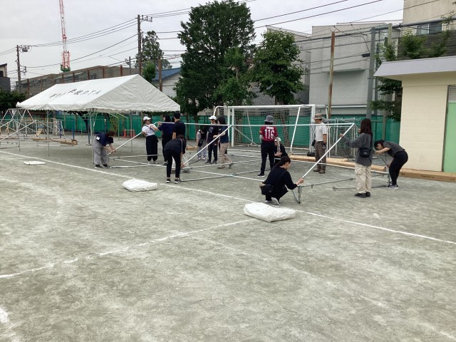 放課後には、おやじの会の皆さんの協力のもと教職員と一緒に暑さ対策のテントを設営しました。天気が心配ですが、風が吹くといいなと思います。