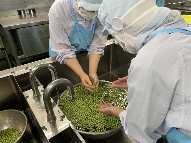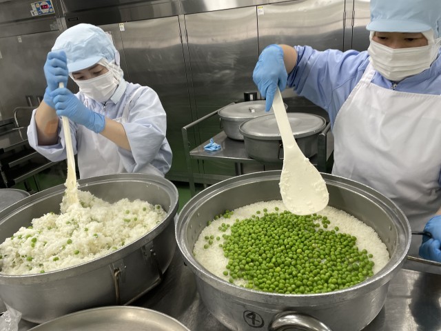 給食室では、3回流水でよーく洗ってから、塩ゆでして、ごはんと混ぜ合わせました。