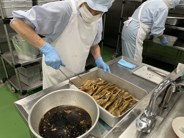 今日は入梅で、暦の上で梅雨入りのことです。梅雨は「梅」の字が使われるように、梅の実が熟す時期です。今日は練り梅を使って作ったドレッシングで野菜を和えたり、「入梅イワシ」という言葉があるほど旬で美味しくなるイワシを蒲焼きにしたり、入梅メニューの給食でした。