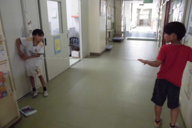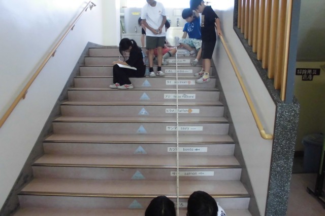 算数で長さについて学習している3年生。今日は学校の様々な場所の長さを測定して報告し合いました。数字上だけではなく、その量的な感覚も養ってきます。