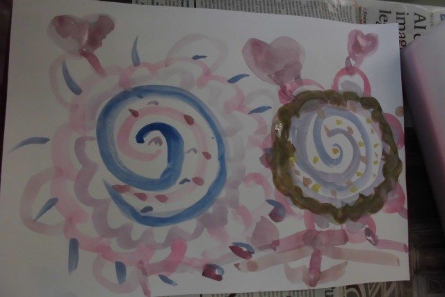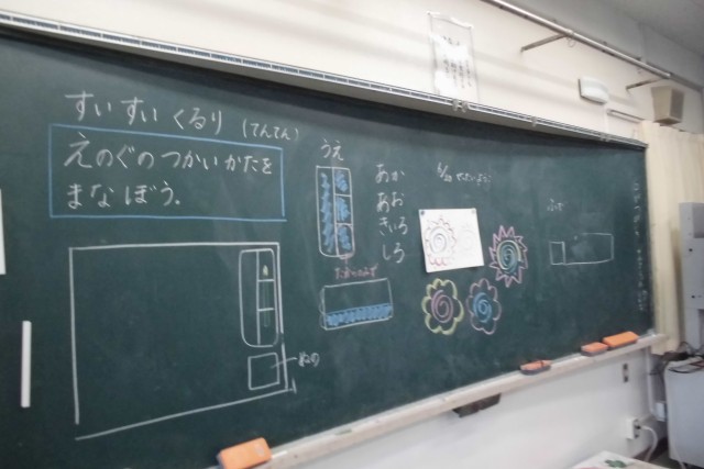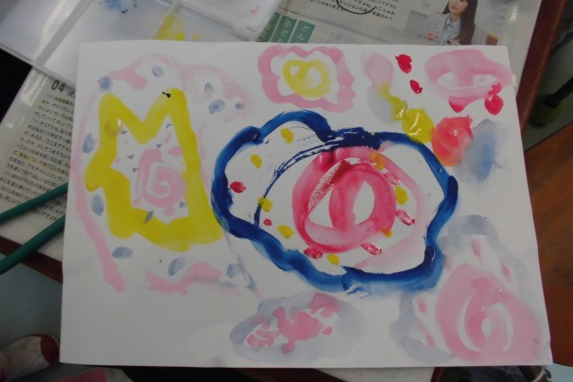 1年生の図工の学習です。はじめて水彩絵の具で絵を描きました。みんなカラフルなすてきな絵を描くことができました。