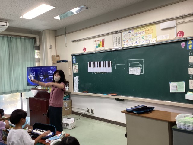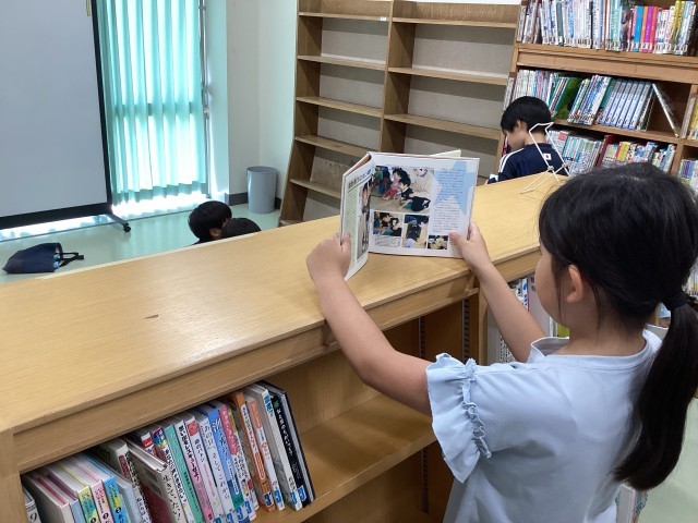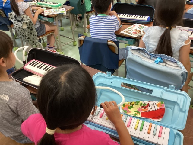 1年生は鍵盤ハーモニカの学習をしています。指の置き方や音の出し方を学び、先生の話をしっかりと聞いていました。ブックコーナーでは読書をしている学級がいました。今週は読書週間が始まりましたので、暑くて外に行けない時には、ぜひ本の世界にも行ってみるといいですね。