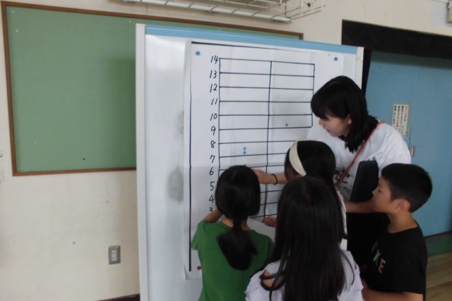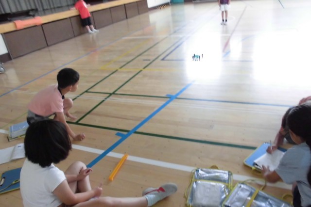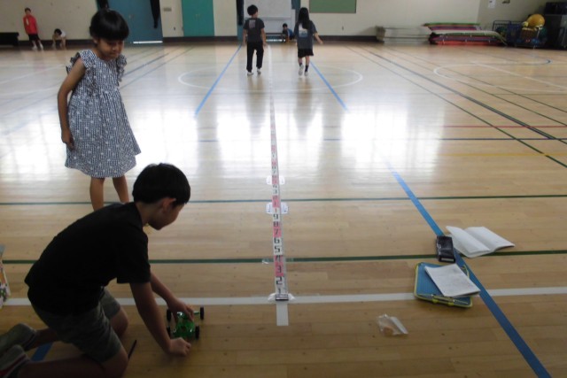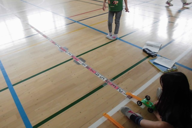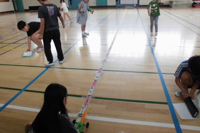 ゴムのはたらきについて学習している3年生。今日はゴムを少し伸ばした時と、たくさん伸ばした時に、車はどこまで動くのかを実験しました。10cmのばした時と20cmの時に、車が動いた距離が大きく変わります。その違いをグラフにまとめ、これから、ゴムを伸ばした時に戻ろうとする力について考察していきます。みんな協力して一生懸命に実験していました。