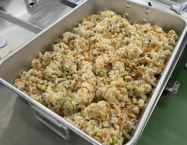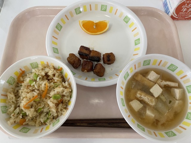 旬の食材をたくさん使った献立です。「バレンシアオレンジ」は今しか味わえない国産(和歌山県産)のオレンジです。暑い日が続いていて食欲が出ないな…という人も多いかもしれません。体を冷やしたり、水分調節を助けてくれる夏野菜や、鉄分・タンパク質が豊富な旬のカツオなど、旬の食材を使ったバランスの良い食事で、暑さを乗り越えたいですね。
