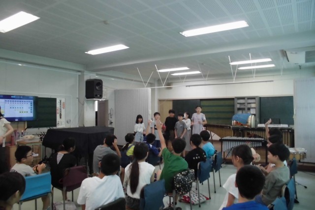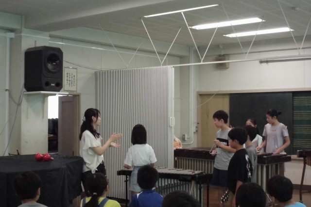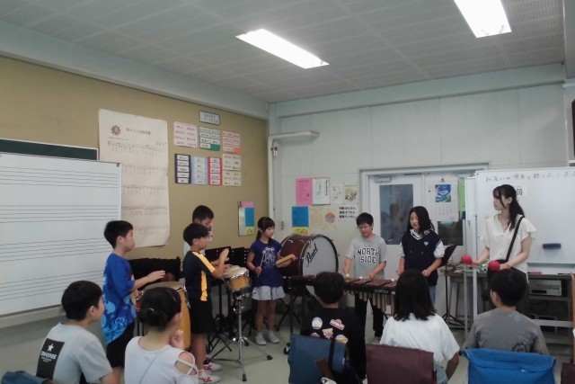 5年生は今、打楽器でリズムアンサンブルの学習をしています。表現する題材をくじで引き、「ジャングル」を引いた班は、ジャングルをイメージした音楽になるように、楽器を選び、強弱、速度、音色を工夫しながら演奏します。聴いている友達はお題は何かを当てます。すると、予想以上にお題を当てることができました。しっかりと楽器を使ってその題材の雰囲気を表現できていることが分かります。更に、もっとその様子を表すためにアドバイスをし合っていきました。次回は最終回。そのアドバイスを取り入れて、より良い表現になるとよいですね。子どもたちの表現力素晴らしいです。