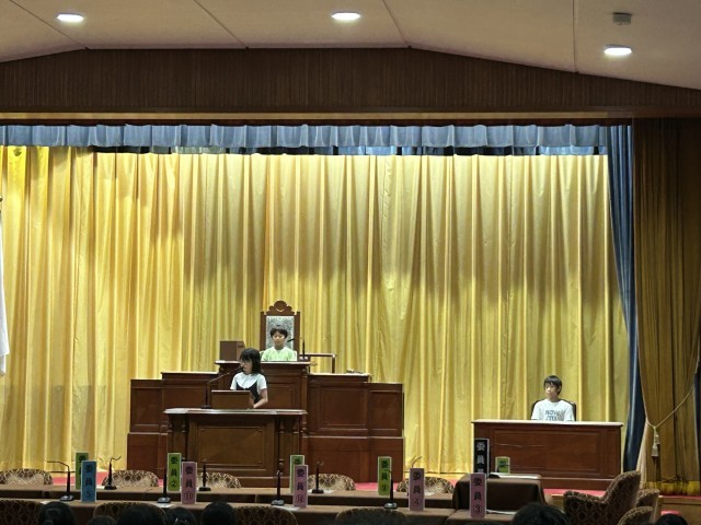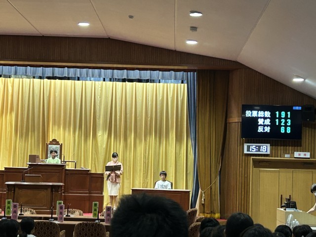 最後のプログラムは、参議院特別体験プログラムで「未成年者喫煙禁止法・飲酒禁止法改正案」についての審議と本会議の模擬体験をしました。代表の議員役や国家公安委員長、参議院議長役のみなさんも大変立派でした。参議院の皆様貴重な体験をさせていただきありがとうございました。