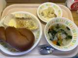 <献立> 黒砂糖パン 牛乳 魚のガーリック焼き ジャーマンポテト 野菜スープ
