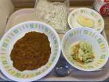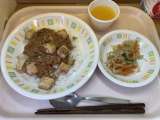 <献立> 島の魚の麻婆丼 牛乳 糸寒天と野菜の和え物 つぶつぶみかんゼリー ...