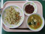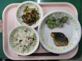 今日の給食は、揚げ大豆ごはん、さばの香味焼き、刻み昆布の五目煮、大根のゆかりかけ...