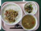 今日の給食は、カラフル丼、豚汁、おひたし、牛乳です。カラフル丼は、鶏そぼろにコー...