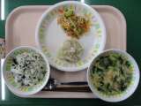 今日の給食は、わかめごはん、ジャンボしゅうまい、もやしのコチュジャンかけ、にらた...