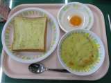 今日の給食は、ガーリックトースト、パンプキンシチュー、おかしな目玉焼き、牛乳です...