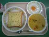 今日の給食は、ガーリックトースト、パンプキンシチュー、おかしな目玉焼き、牛乳です...