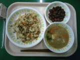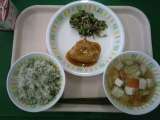 今日の給食は、かおりごはん、つくね焼き、やさいののり和え、豆腐汁、牛乳です。つく...