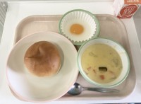 <献立>ミルクパン牛乳パンプキンシチューおかしな目玉焼き