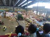 大田市場では、野菜や果物の箱がたくさん並び、多くの人が働いていました。セリの仕方...