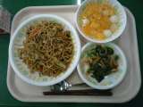 きょうの給食はソース焼きそば、ごまドレサラダ、フルーツ白玉、牛乳です。今日は子ど...