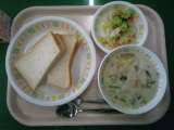 今日の給食はジャムサンド、季節野菜のクリームシチュー、ゆで野菜のドレッシングかけ...