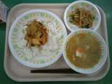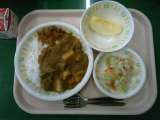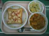 今日の給食は、カレーライス、福神漬、キャベツサラダ、りんご、牛乳です。給食では大...
