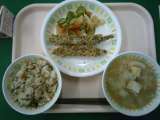 今日の給食は、かきあげ丼、豚汁、わさびあえ、牛乳です。かきあげ丼は、ごはんの上に...