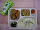 ☆今日の給食☆ 緑茶とお弁当(ごはん・ごましお 鶏肉の唐揚げ 切干大根の煮付け...