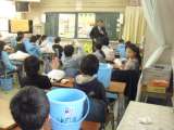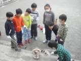四年生がバケツ稲の体験にむけて、準備に取り掛かっている様子です。手がドロドロにな...