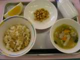 献立:たけのこごはん・牛乳・トビウオ団子入りみそ汁・ぶどう豆・美生柑 今日...
