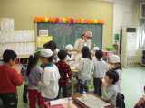 がんばって給食当番をしています。静かに待っています。おいしい給食までもう少しです...