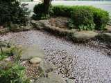 ビオトープの池に、桜の花びらが落ち、敷き詰められたようになっています。休み時間に...