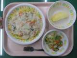 4月20日の給食は、ココアビスキュイパン、ボルシチ、白菜とチーズのサラダ、牛乳で...