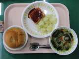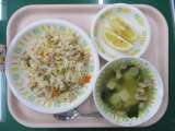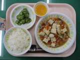 今日の給食は、ごはん、豆腐の五目炒め、きゅうりの中華味、つぶつぶオレンジゼリー、...