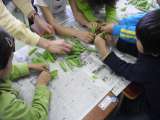 1年生が給食のお手伝いをしました。グリンピースのさやむきに挑戦しました。むいたグ...