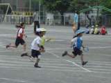 校庭の高学年リレーの練習風景です。晴れた陽ざしの中、懸命に走っていました。