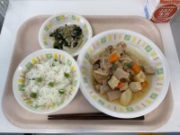 <献立>グリンピースごはん牛乳新じゃがのそぼろ煮じゃこサラダグリンピースは生のも...