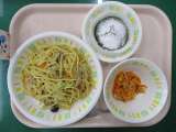 今日の給食は、和風スパゲティ、にんじんサラダ、抹茶のカップケーキ、牛乳です。今日...