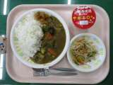 今日の給食は、夏野菜のカレーライス、こんにゃくサラダ、ヨーグルト、牛乳です。夏野...