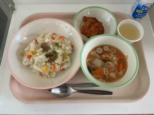 <献立>ピラフジョアタンドリーチキンABCトマトスープはちみつレモンゼリー今日で...