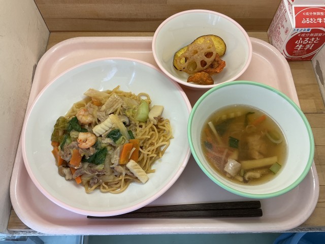 <献立>五目あんかけ焼きそば牛乳春雨スープ根菜チップス