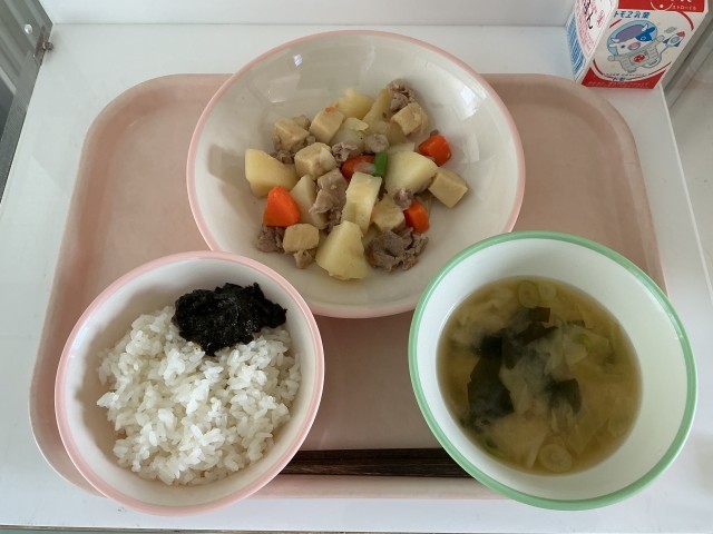 <献立>ごはんのりの佃煮牛乳塩肉じゃが味噌汁
