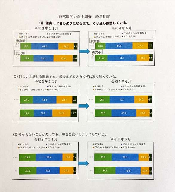 「粘り強く取り組む」ことに学校全体で価値を置いた結果、今年度の東京都学力向上調査では学習への取り組み方が顕著に変化しました。