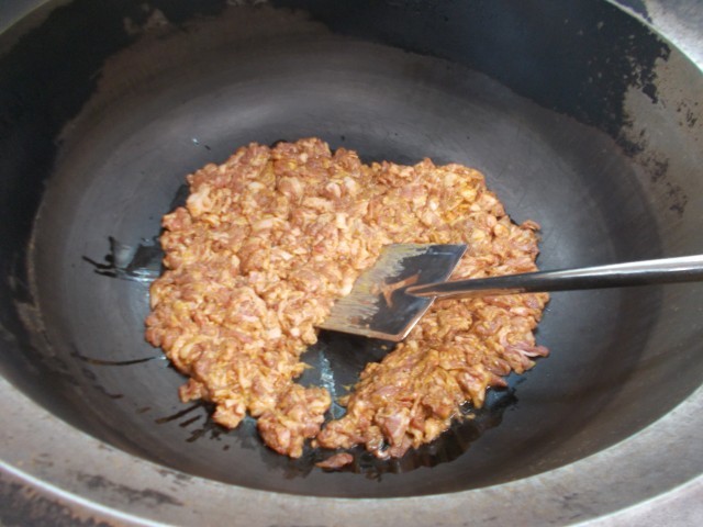 肉じゃがはみそ味です。豚肉に赤みそで下味をつけてから調理していきます(写真3枚目:下味をつけた豚肉を炒めるところ)。みそを入れることでいつもの肉じゃがよりコクが出て、ごはんが進みます。主菜の味付けがしっかりしているときは、副菜のおひたしをやさしい味にして全体のバランスをとります。ただ塩分を控えるのではなく野菜にかつお節を和え、うまみでカバーしています。