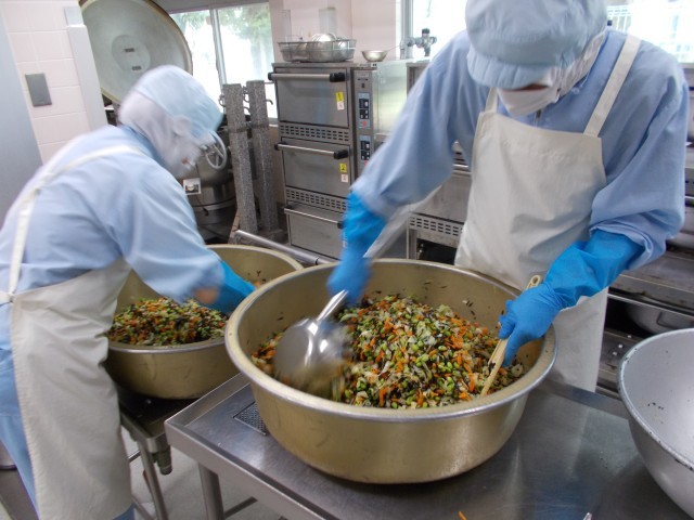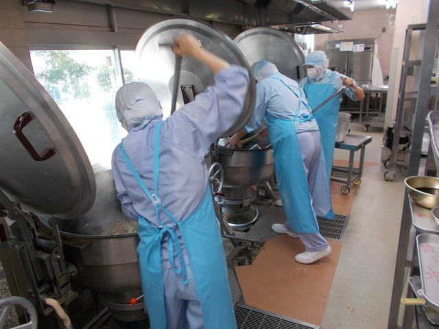 今日は奥沢中学校で作る最後の給食でした。最後の給食は、かぼちゃやなすなどの夏野菜がゴロッと入った夏野菜カレーです。かぼちゃは蒸してから、なすはオーブンで焼いてから仕上げに加えます。最終日ということで、調理員さんたちはいつも以上に気合を入れて、そして心を込めて作ってくれました。